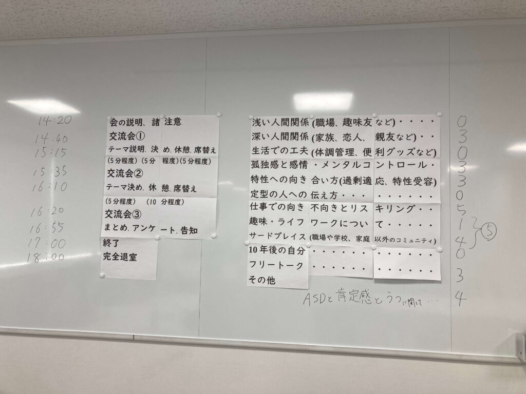 - お互い初対面の人が多い場であるけれど、前提条件(ASD傾向や軽めの診断ありなど)が概ね同じなため、安心して自己開示ができた。
