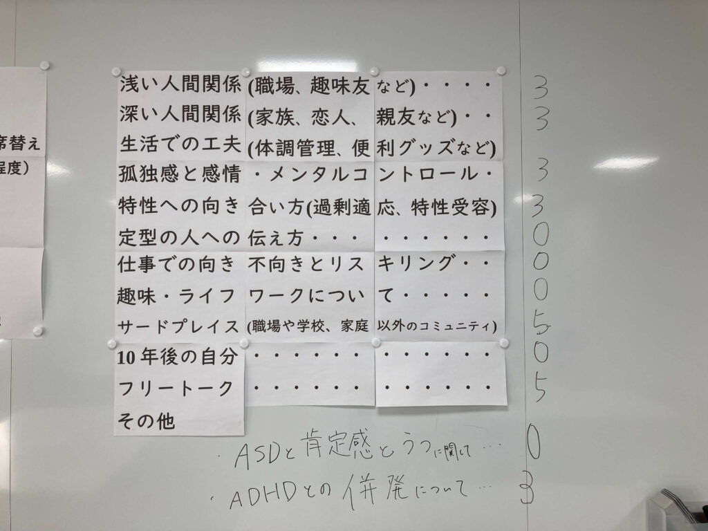 また、参加者の方から「ASDと肯定感とうつに関して(相互の影響など)」「ADHDとの併発について」といったテーマを提案していただきました。