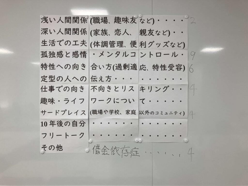 また、参加者の方から「借金依存症」というトークテーマを上げていただき、発達特性とからめた原因や解決方法などをシェアしていただき、とても有意義なテーマとなっていました。