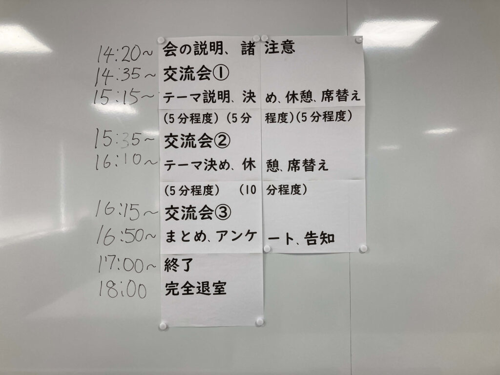 | 15:10~ | テーマ説明(5分程度)・テーマ決め(5分程度)・休憩(5分程度)・席替え |